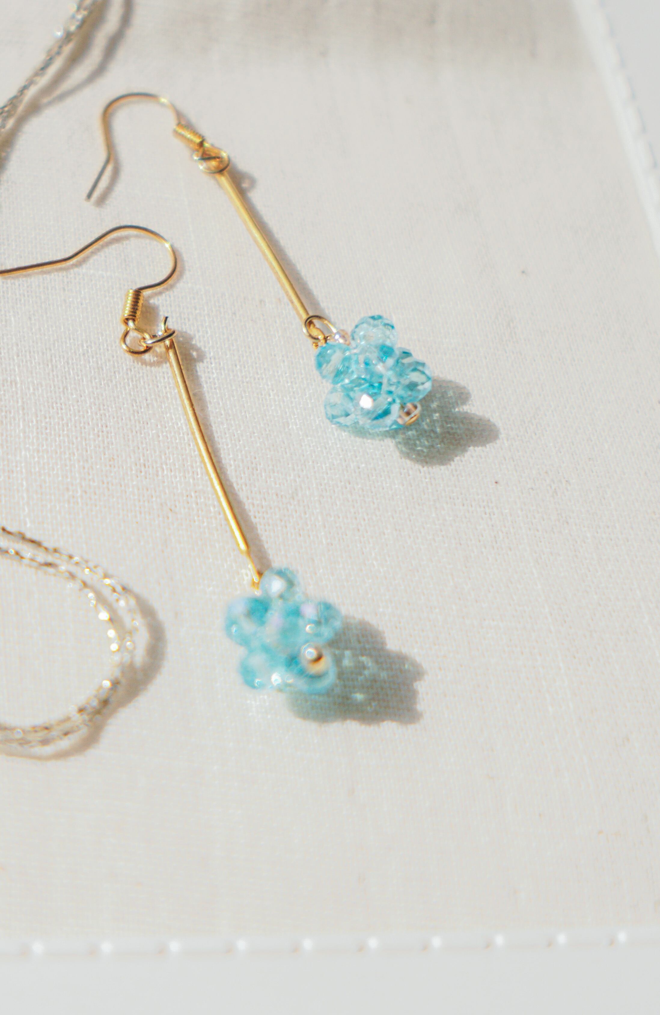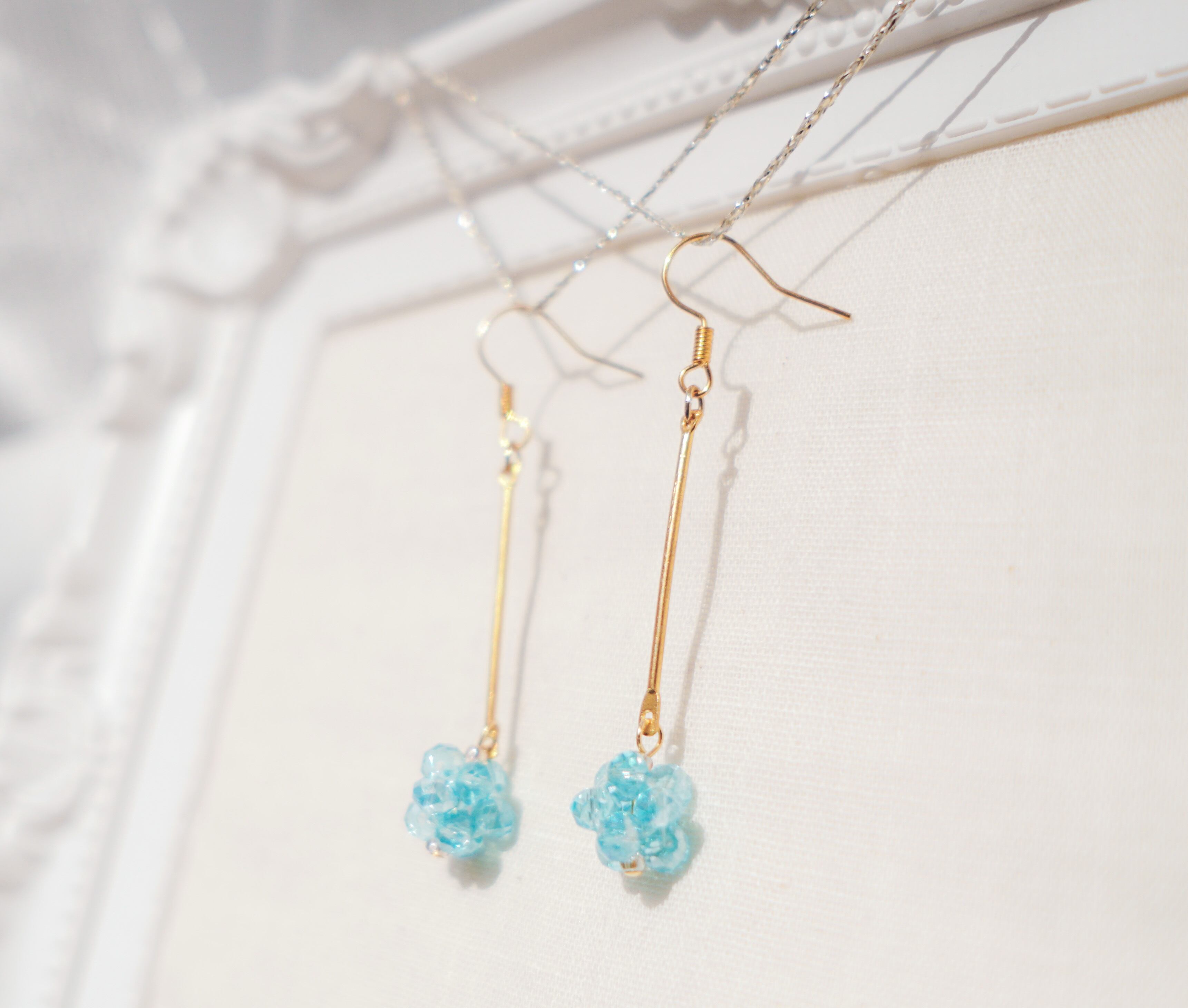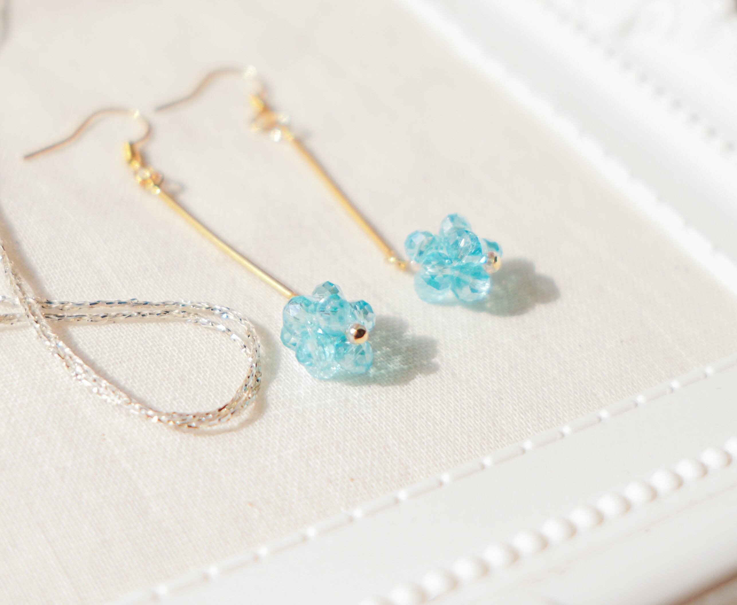 水色のビーズを鞠のように仕上げ、鞠状のビーズだけが揺れるようにつくりました。夏に涼しげな印象をくれると思います。ショートヘアーの方でも少し見えるように長さをつけております。