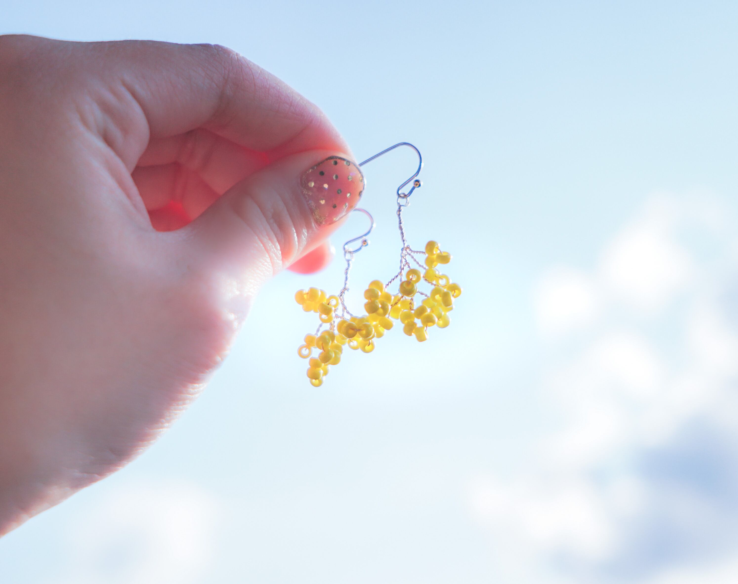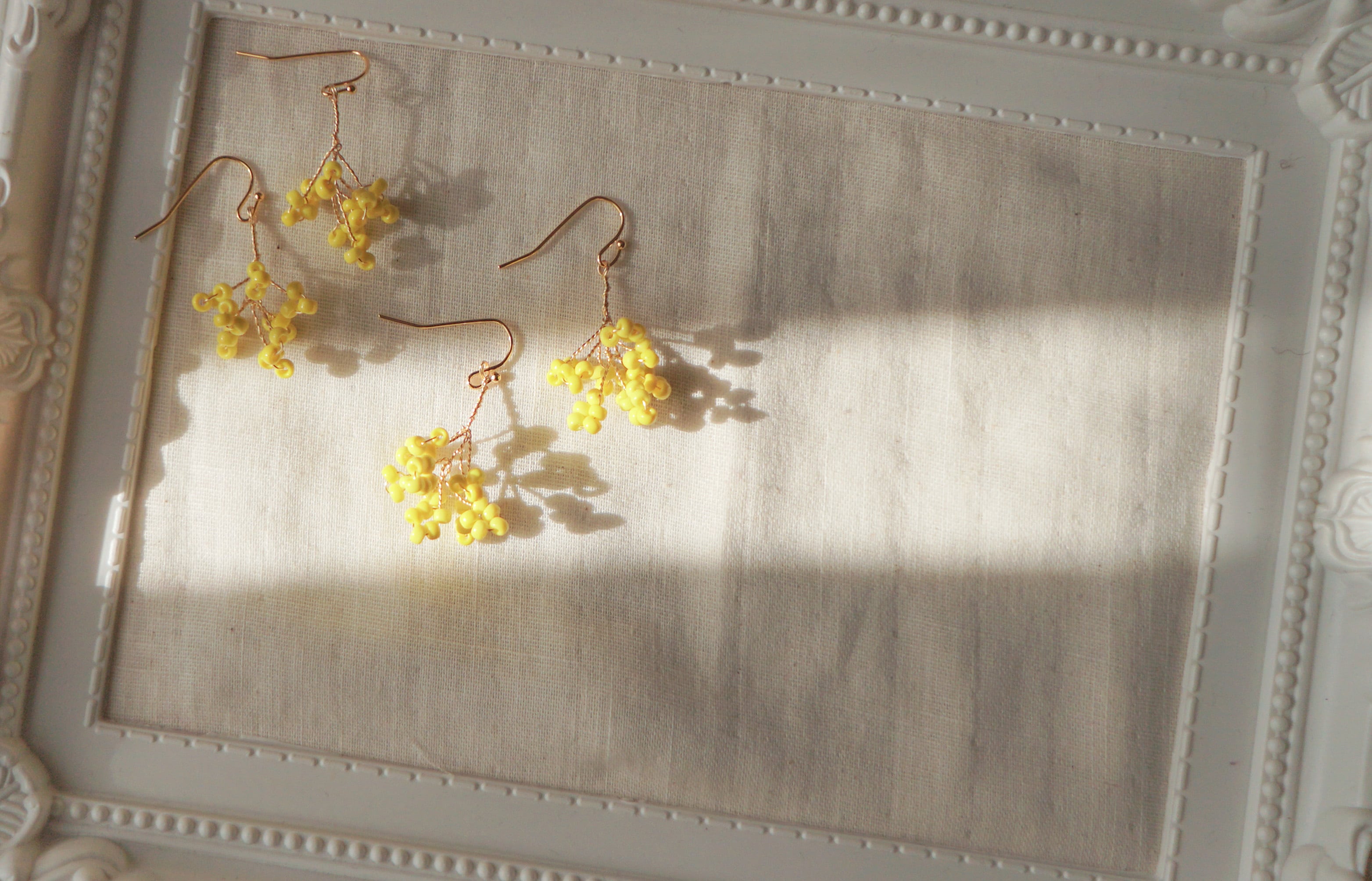春をイメージしたピアスです。ミモザや、菜の花のように黄色を春の色として、木、花束の様な形に仕上げました。