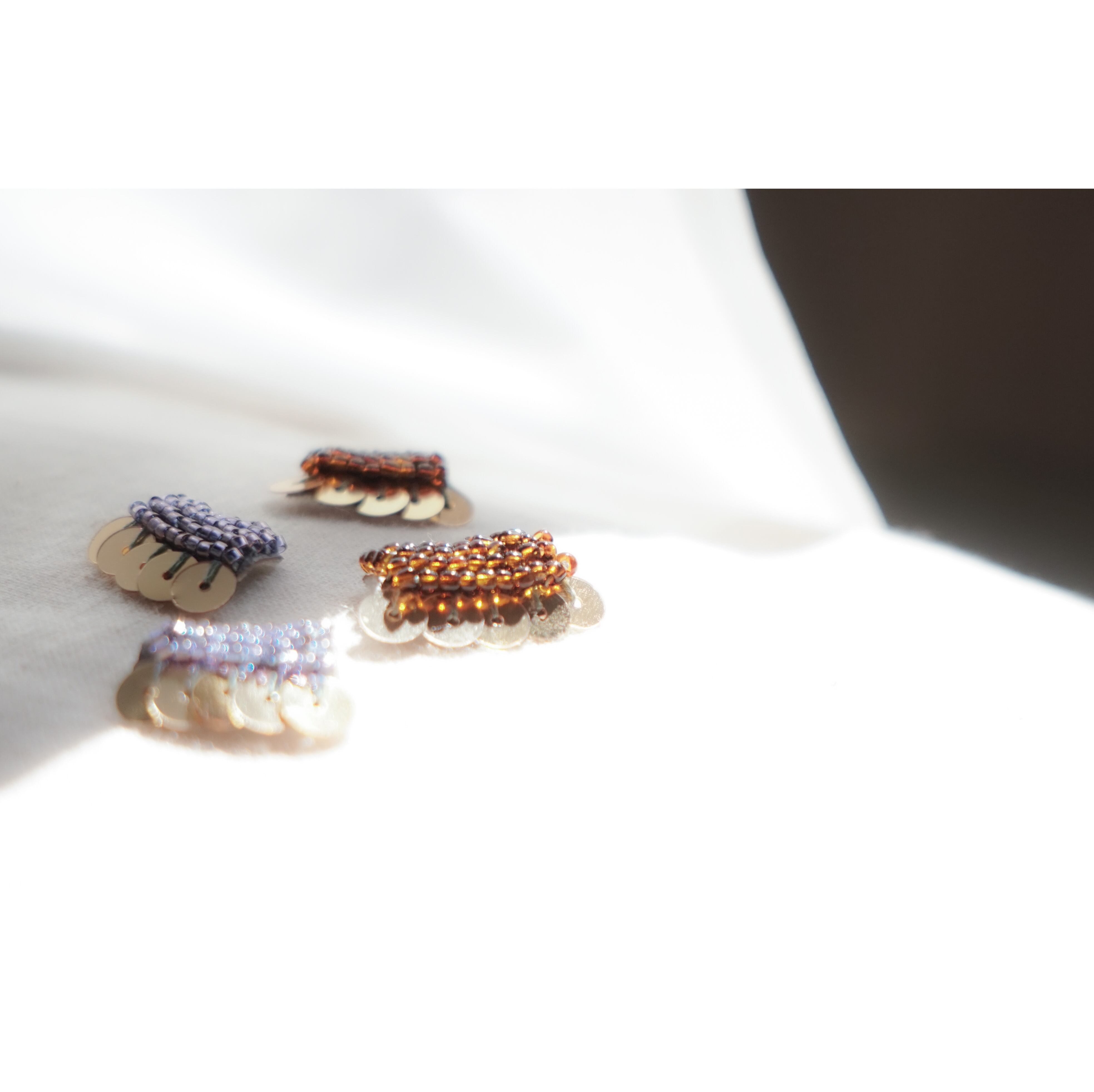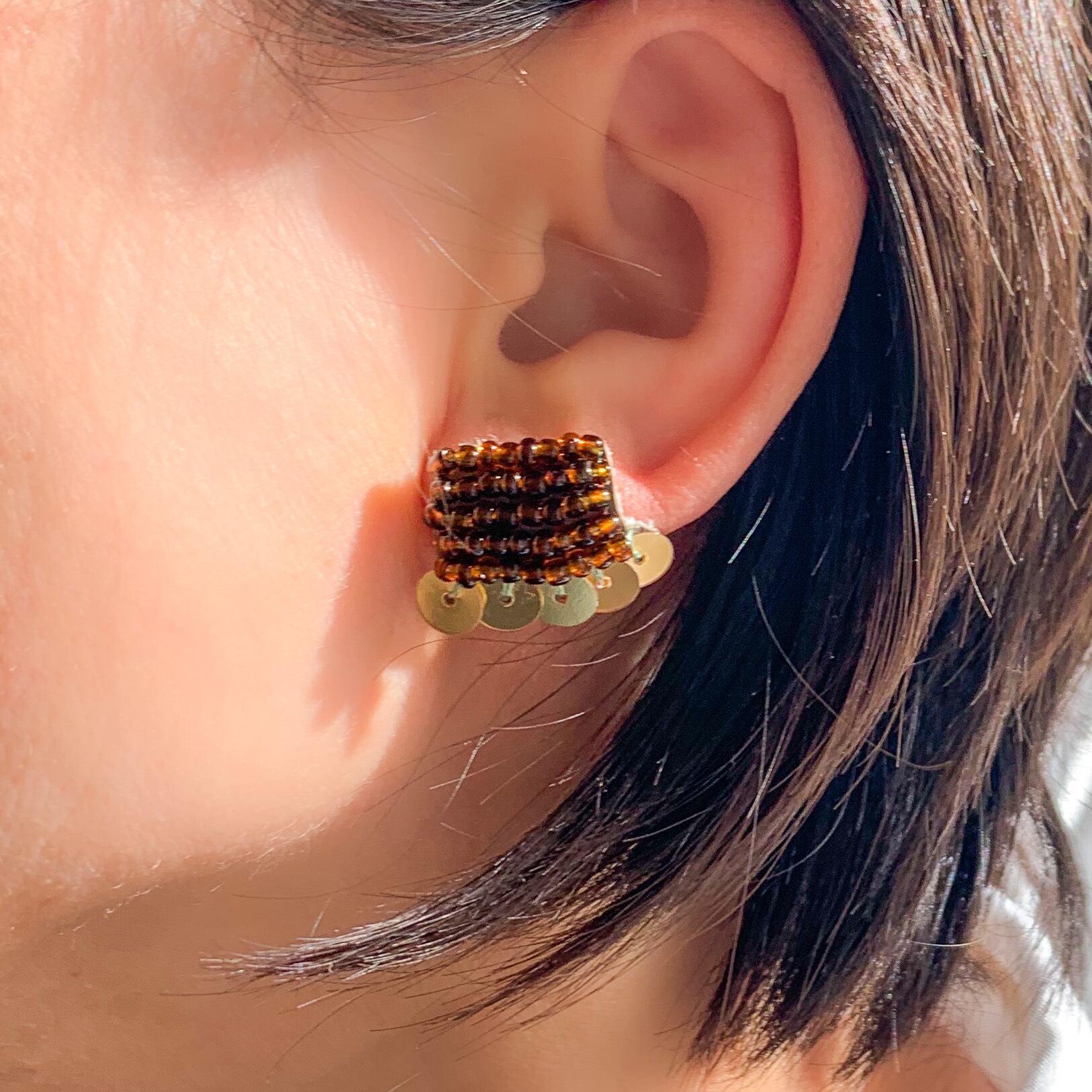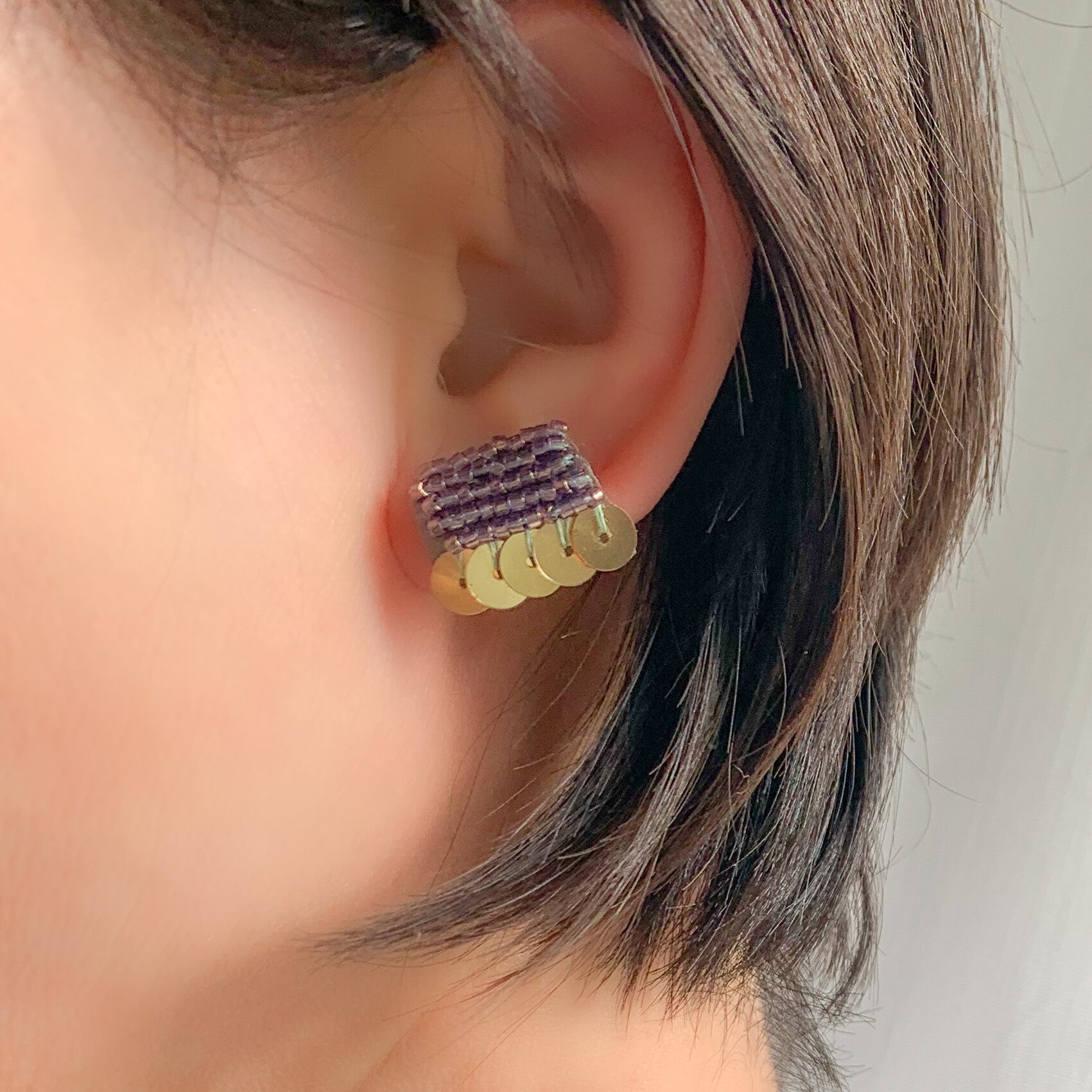 少し透き通ったビーズとスパンコールの輝きが魅力です。縦につけても横につけてもオススメです。こちらはピアス、イヤリングどちらでもお作り致しますので。発送まで4日ほどお時間いただきます。ご了承くださいませ。