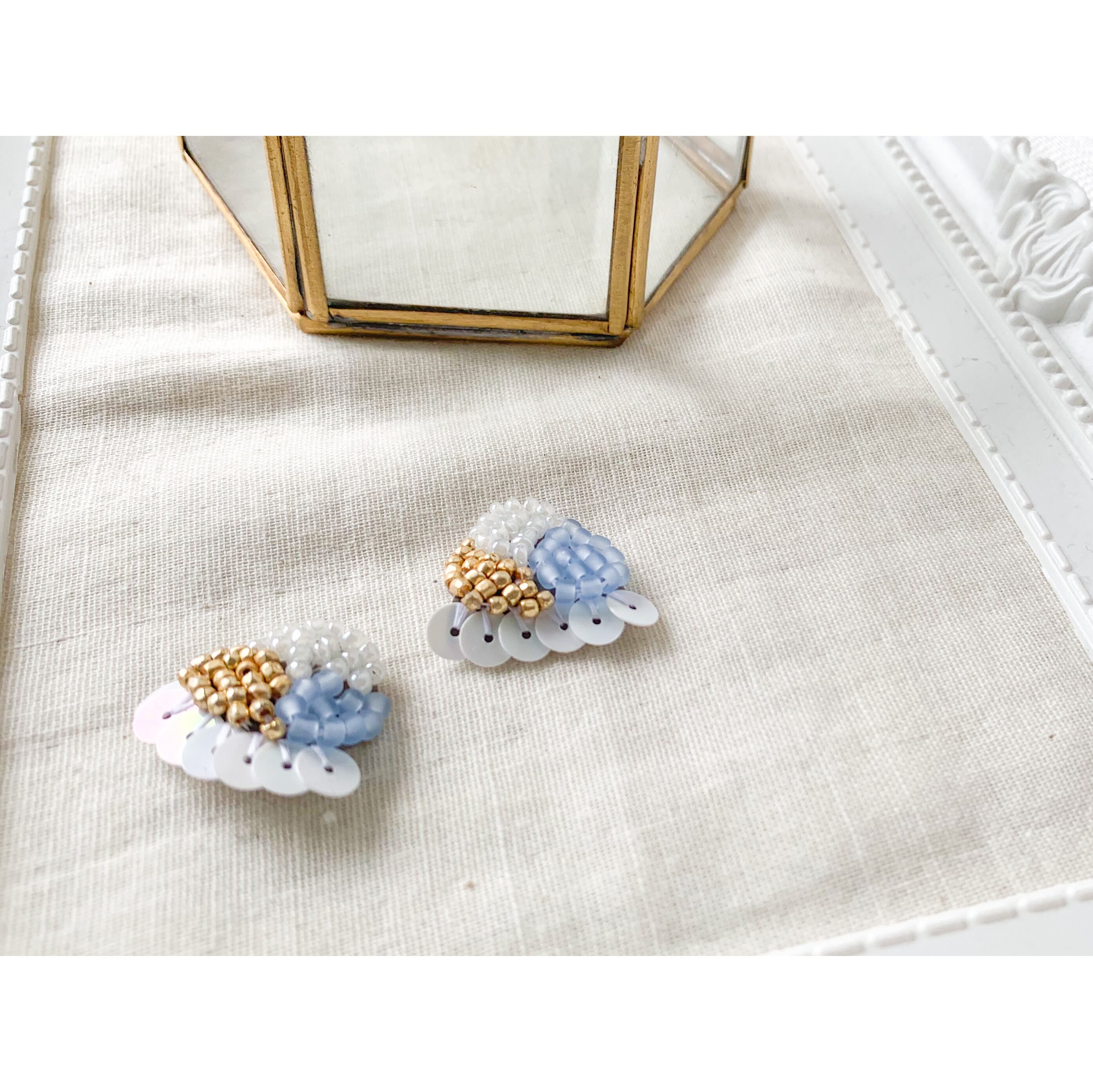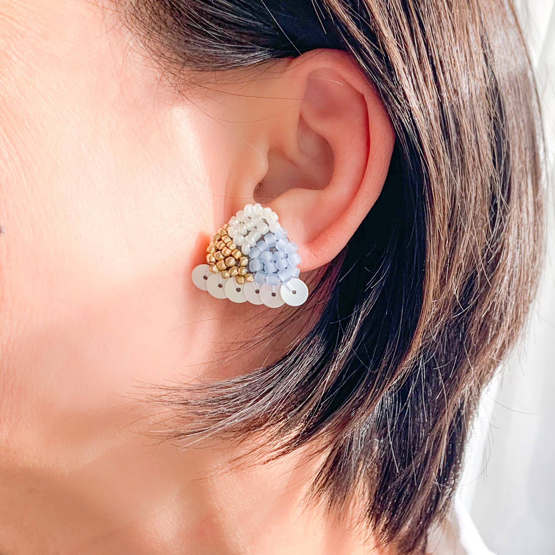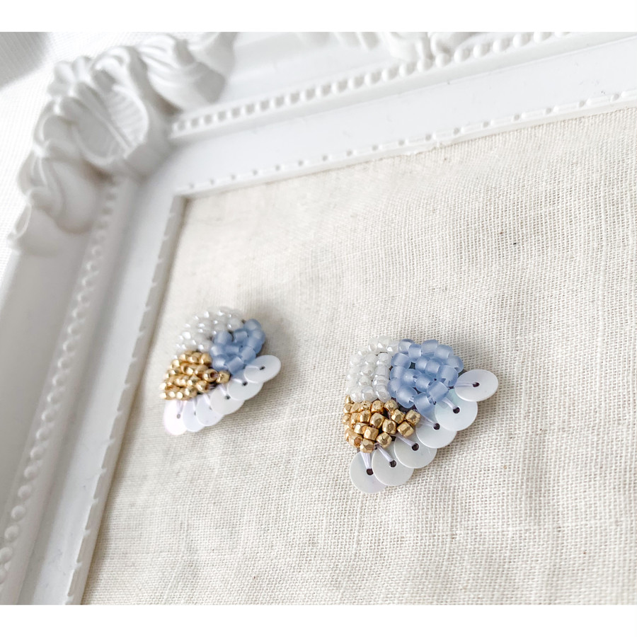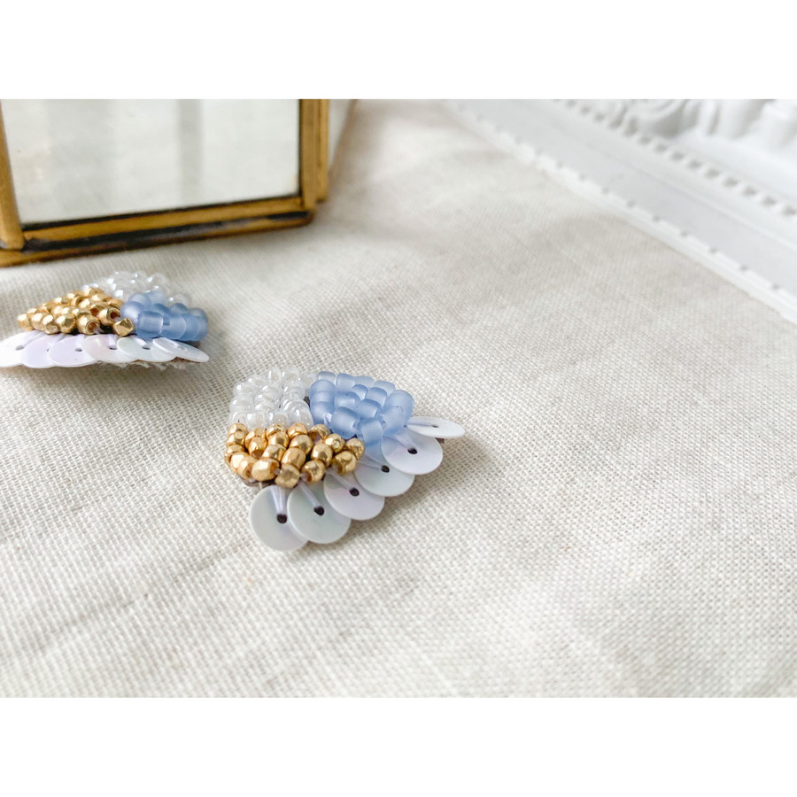 スパンコールをフリルのように縫い付けた、刺繍ビーズのイヤリングです。ピアス、イヤリングどちらも作成可能です◎