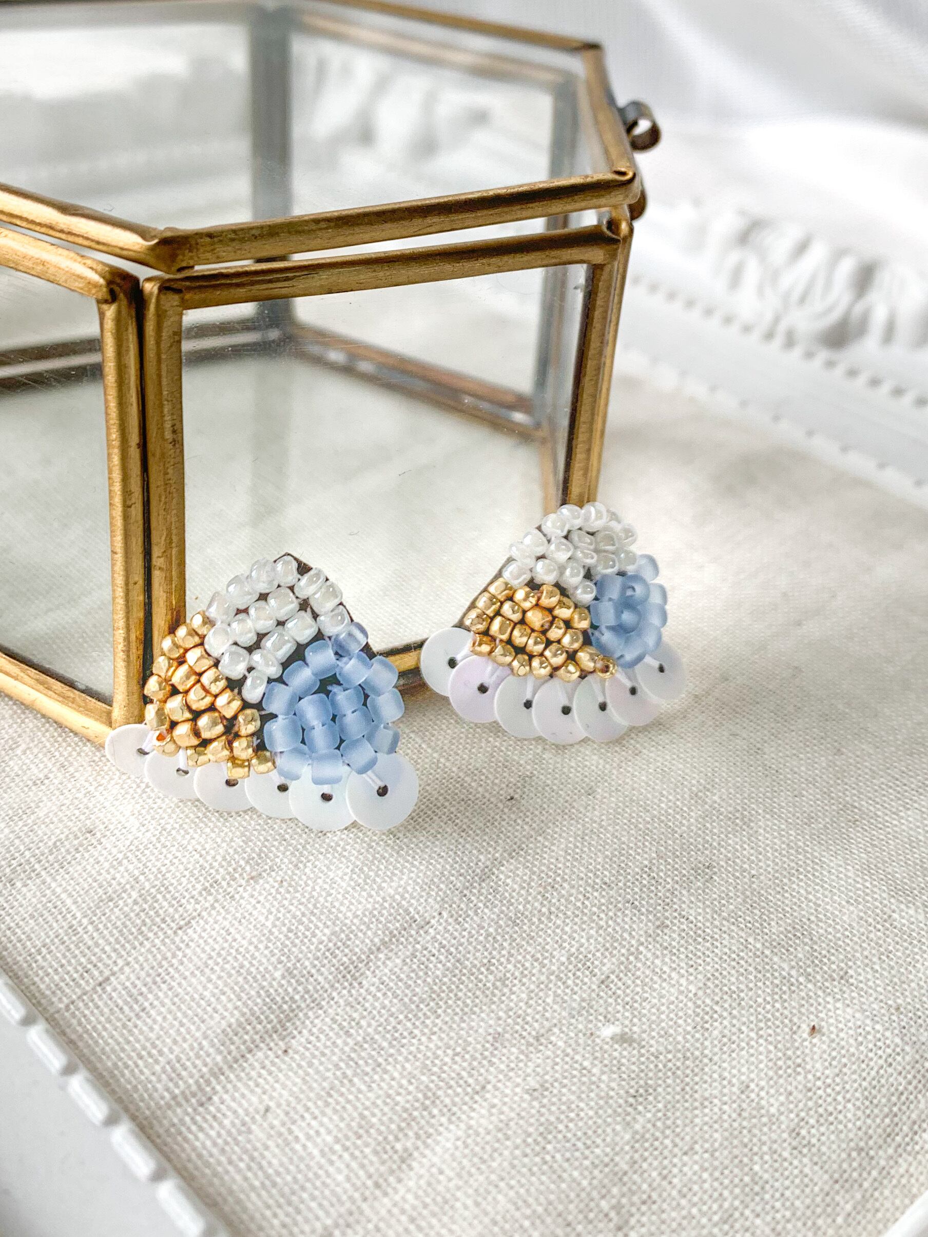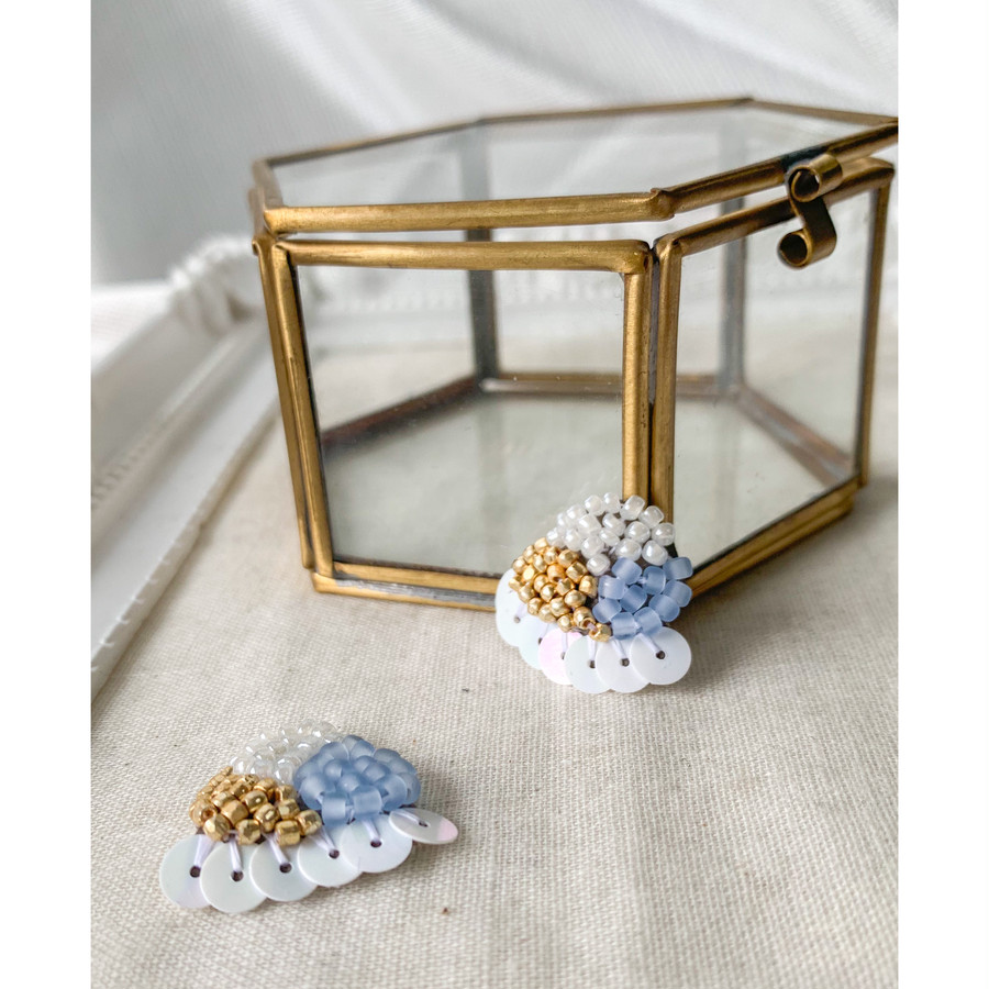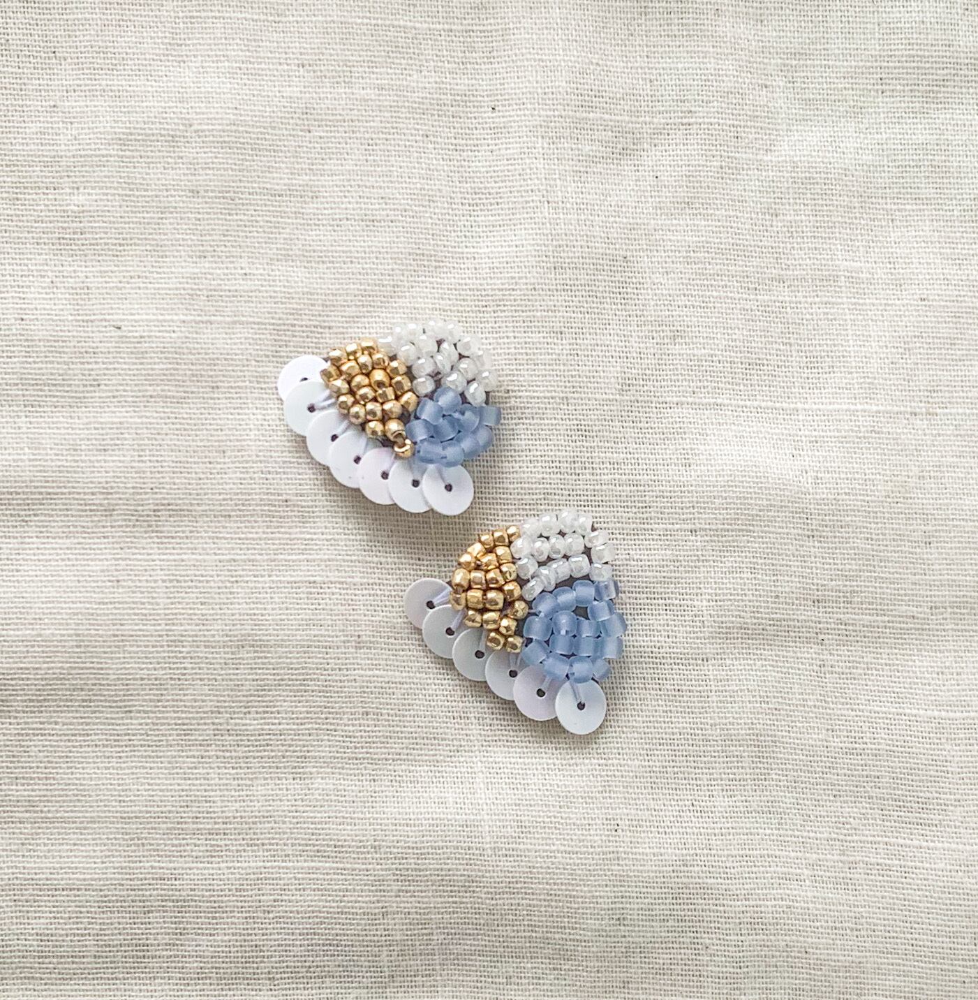 スパンコールをフリルのように縫い付けた、刺繍ビーズのイヤリングです。ピアス、イヤリングどちらも作成可能です◎