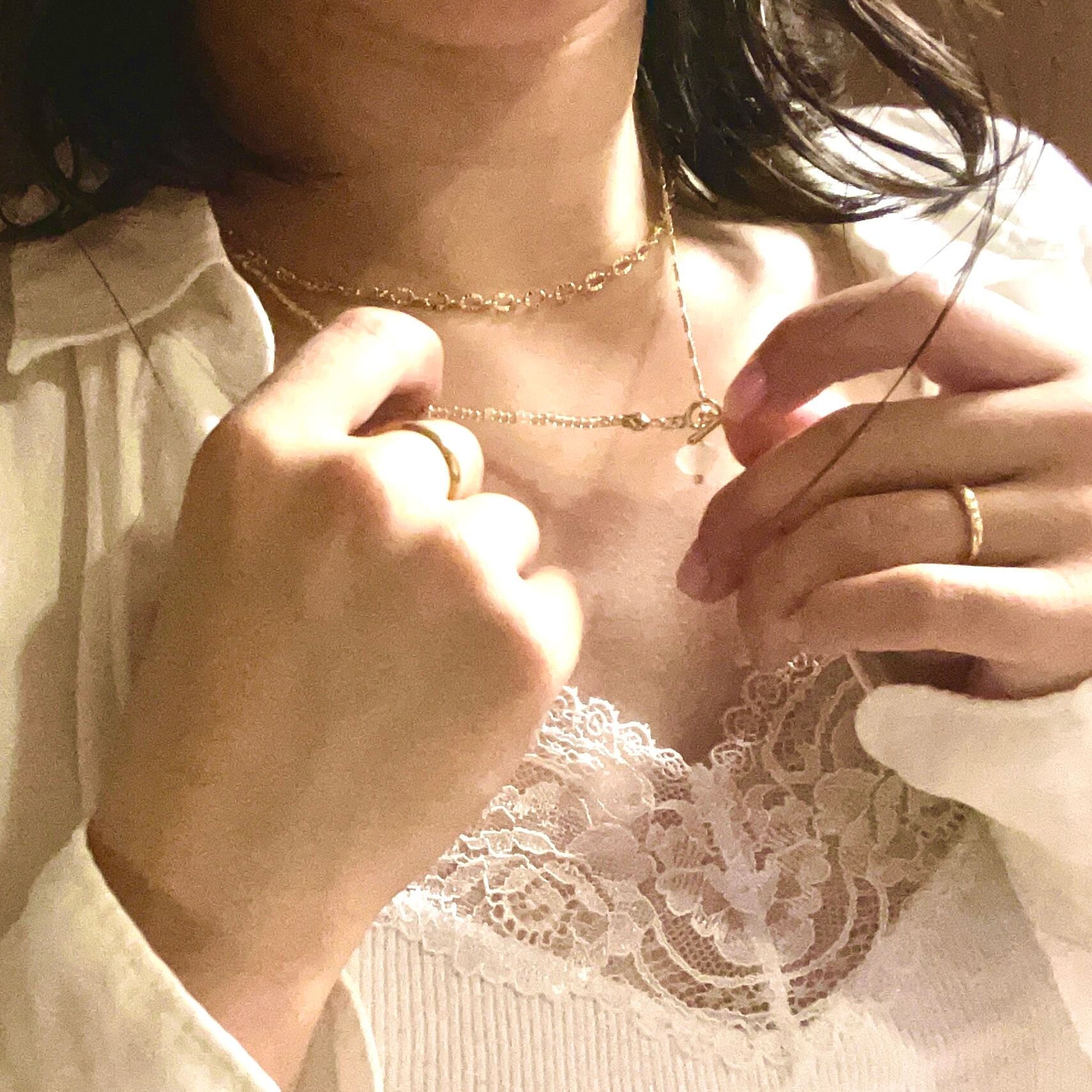ゴールドチェーンとビーズが中央部分で分かれいる、一味変わったネックレスチェーンでございます。